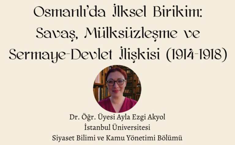 Osmanlı’da İlksel Birikim: Savaş, Mülksüzleşme ve Sermaye-Devlet İlişkisi Dr. Öğr. Üyesi Ayla Ezgi Akyol ile gerçekleştireceğimiz Çarşamba Söyleşisi’ne katılmanız dileğiyle… 8 Nisan 2026 – 17:00 Zoom – Link: zoom.us/j/99100490472 Zoom – ID: 991 0049 0472 Şifre: 936890
